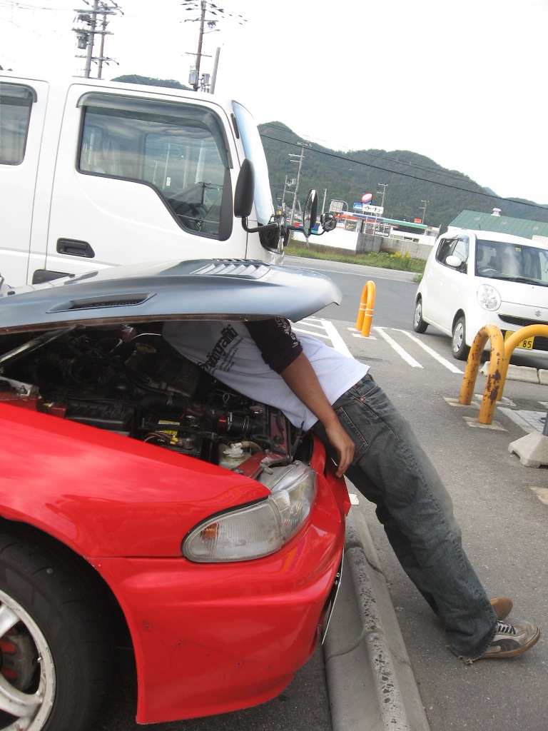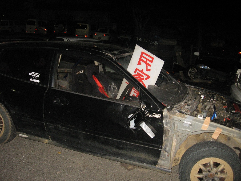 この車の前でお昼寝している天パの青年がkawamuraだ。「シビックいいっすね!」と先輩に言っておきながら、「やっぱFRに乗りたい」と、ヤフオクで13シルビアを買ってきた。愛媛出身でみかんカラーの車はウケがいいと思ったのであろう。大きな間違いである。ただ、七帝ではブライアンに眼をつけられることに成功したから良しとしよう。ターボがとてもパワフルな彼の車の得意技は「ロック刺し」。フェンダー、ボンネット、バンパーの色が変わり、周囲から「腐ったみかん」とよばれ、ちょっとかわいそう。当初は整備のたびにしんどそうな顔をしていたが、最近はみかんが腐るほど元気になるようで、刺した後のぎこちない空元気が、だんだんマジ元気になってきた。でもソノクルマ、彼女はなんて言ってるの?