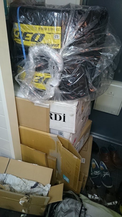 んで最後に僕の家の玄関の写真です。買ったホイールと部車用のタイヤのせいでクソ狭くなっていますがこれが正しい自動車部員の家の姿だと思っています。